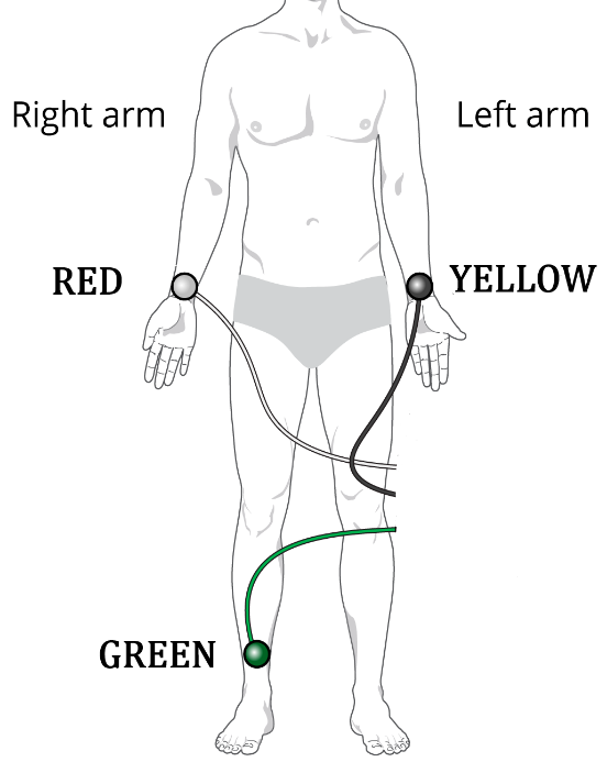 Cihazı vücuda bağlamak için 3,5 mm erkek telefon jakına sahip herhangi bir 3 uçlu EKG kablosu kullanılabilir. Çoğu üç uçlu EKG kablosunda uçlar kırmızı, yeşil ve sarıdır. Kırmızı uç sağ ele, sarı uç sol ele, yeşil uç ise kişinin sağ bacağına bağlanır.