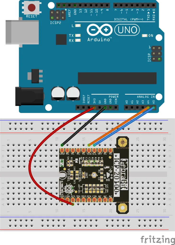 - ICP20100 modülünün 3V3 pinini ARDUINO UNO kartının 3V3 çıkış pinine bağlayın. (Kırmızı kablo)